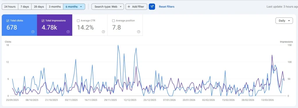 The following metrics are pulled directly from Google Search Console covering the period September 25, 2025 March 26, 2026. The website was built and optimised from the ground up during this window.